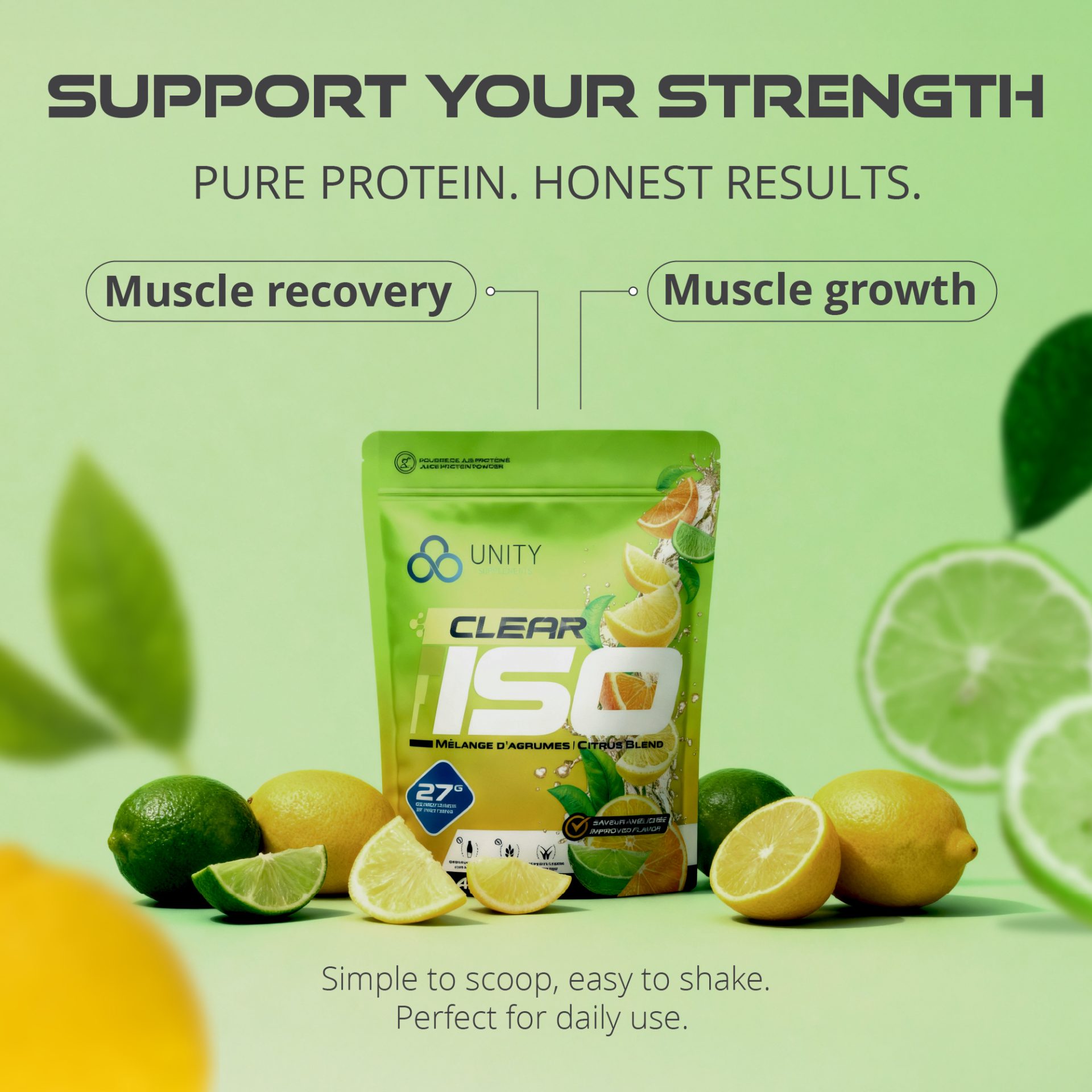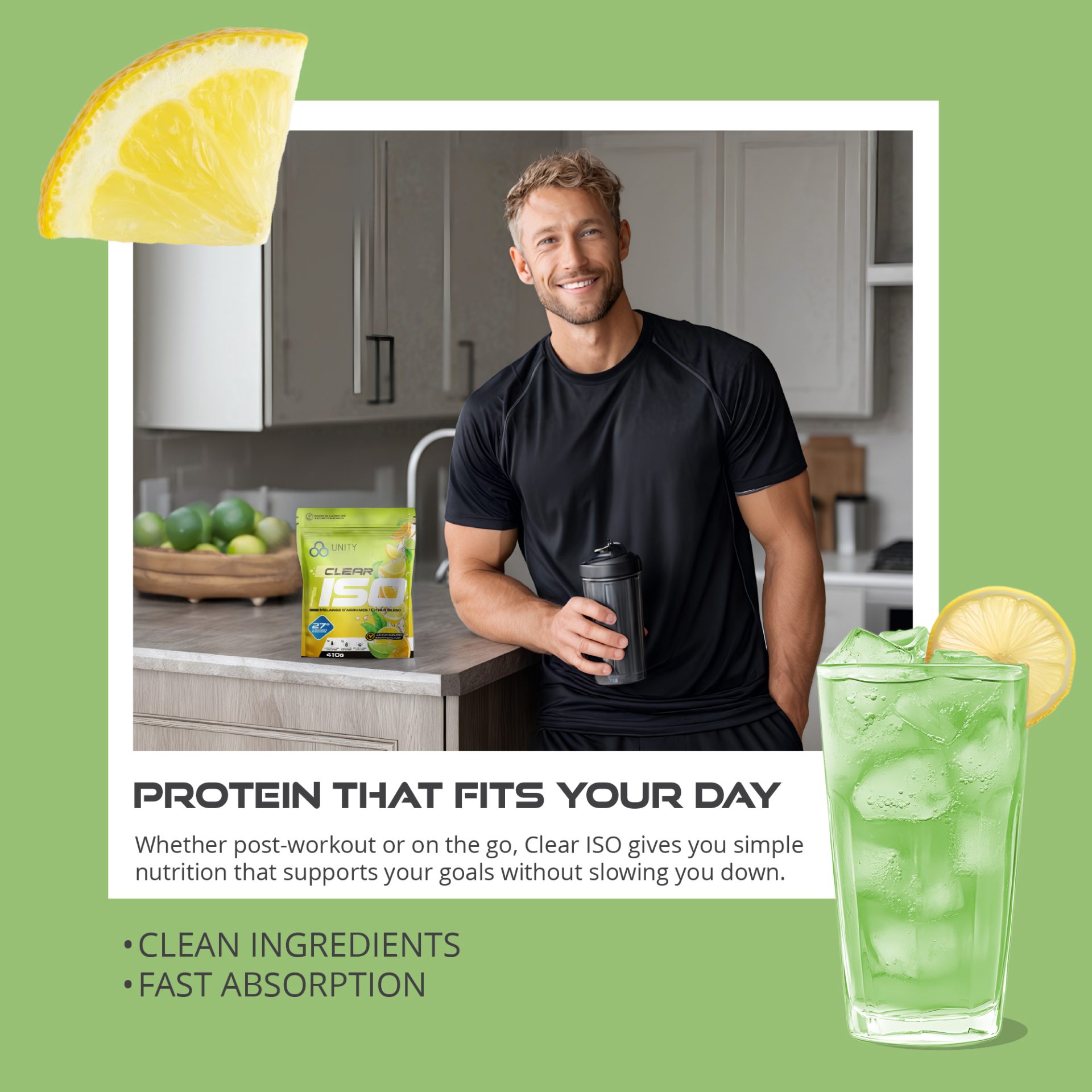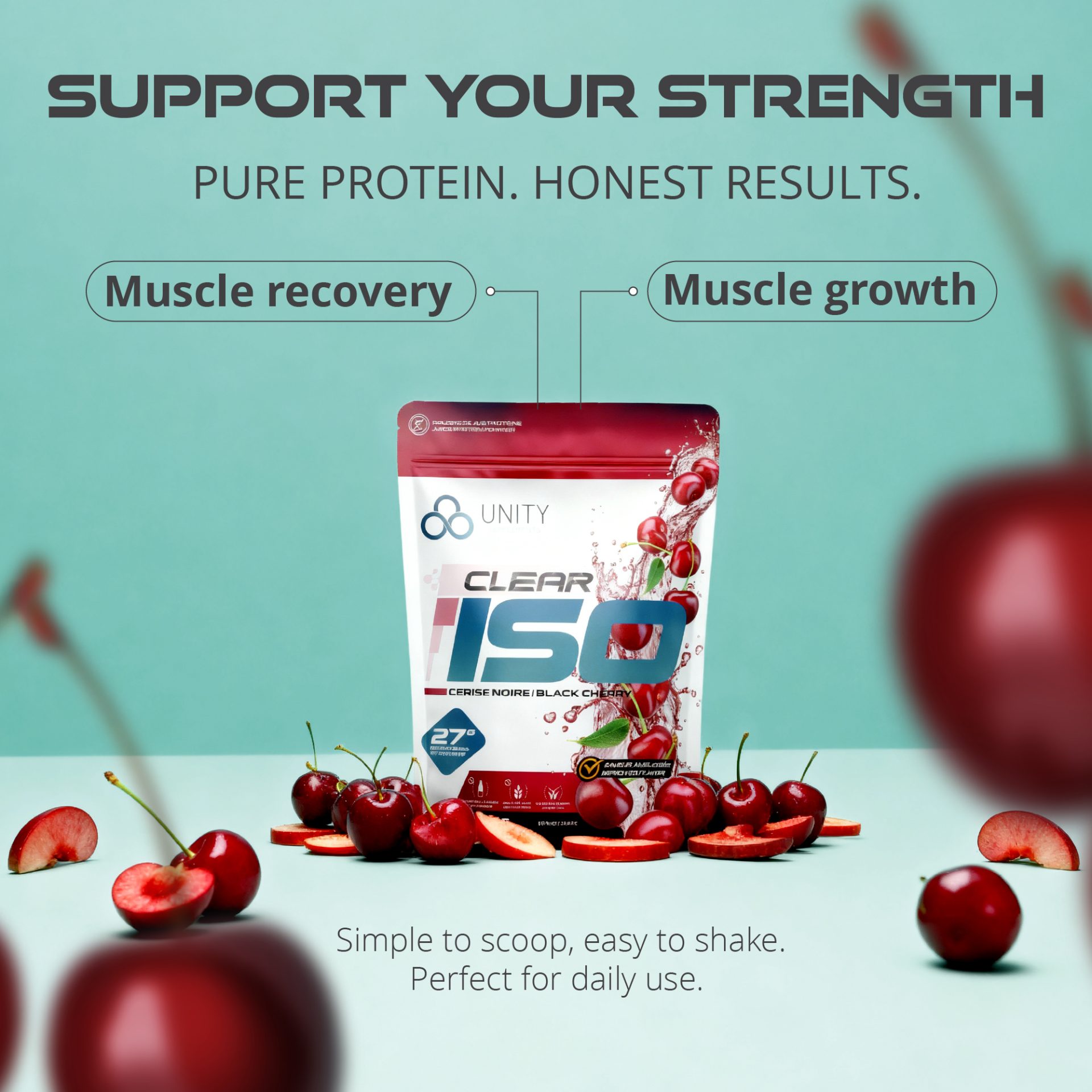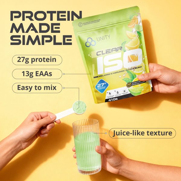 Created Amazon secondary images for Unity Supplements Clear ISO protein powder, a fruity, juice-style formula where flavour appeal is a key purchase driver. With only product renderings and brand typefaces provided, I developed a visual system that emphasized vibrant flavours and refreshment. To overcome the lack of assets, I combined AI-generated imagery using precise, flavour-focused prompts with carefully selected stock visuals, ensuring cohesive, on-brand compositions optimized for Amazon conversion.