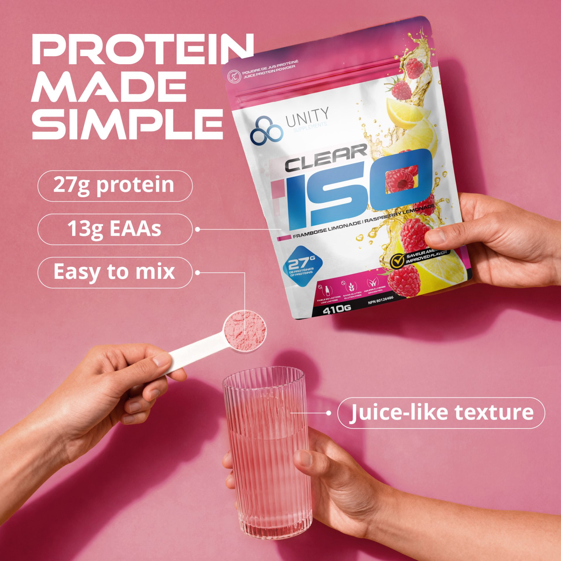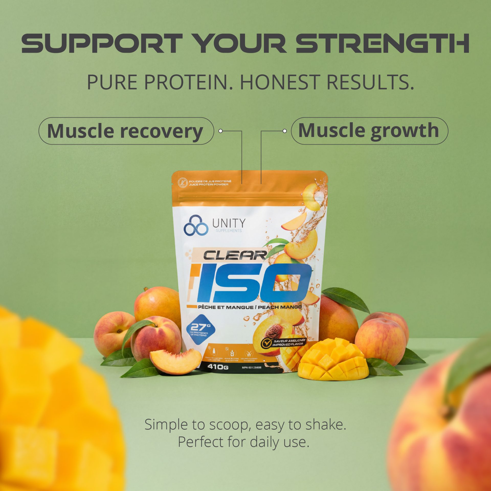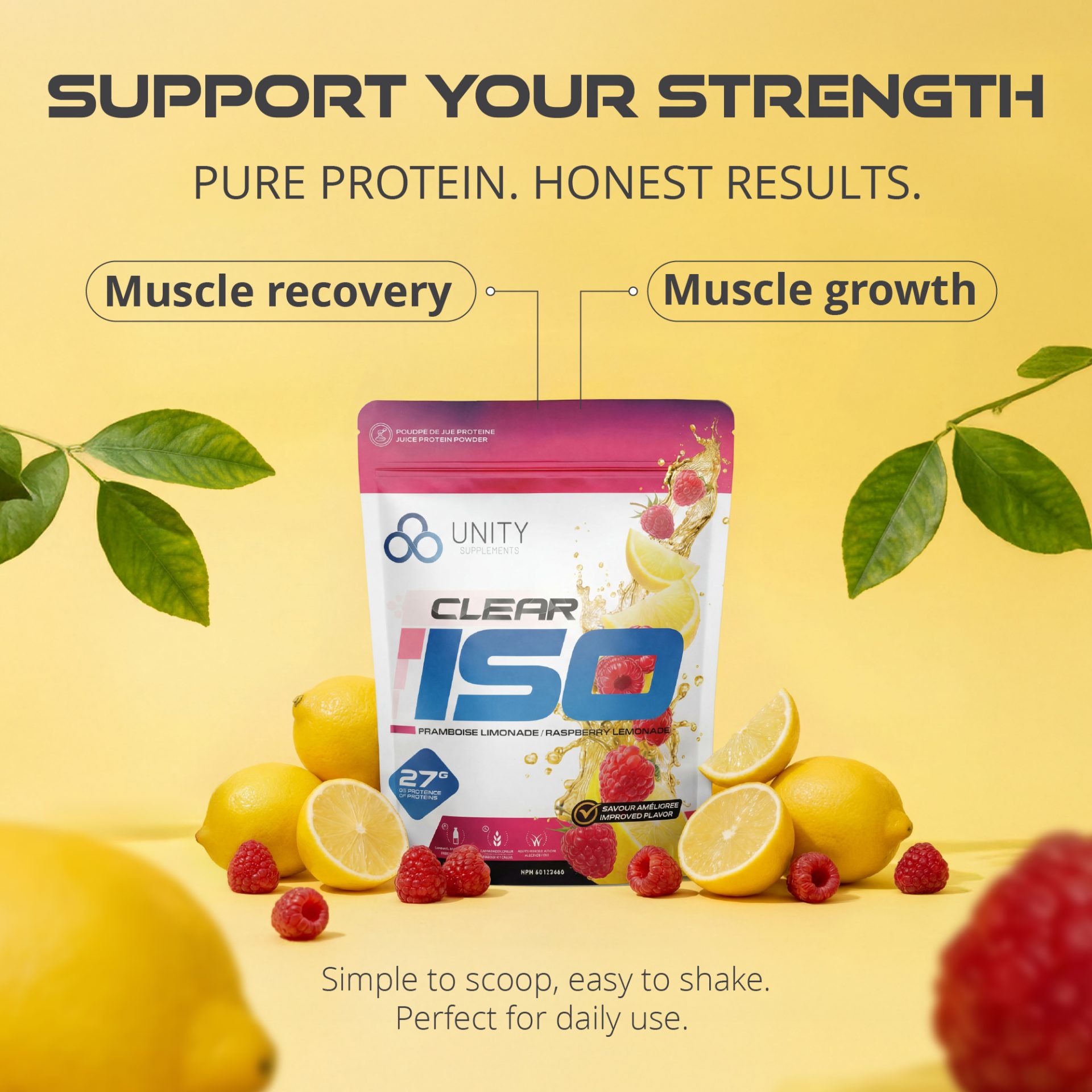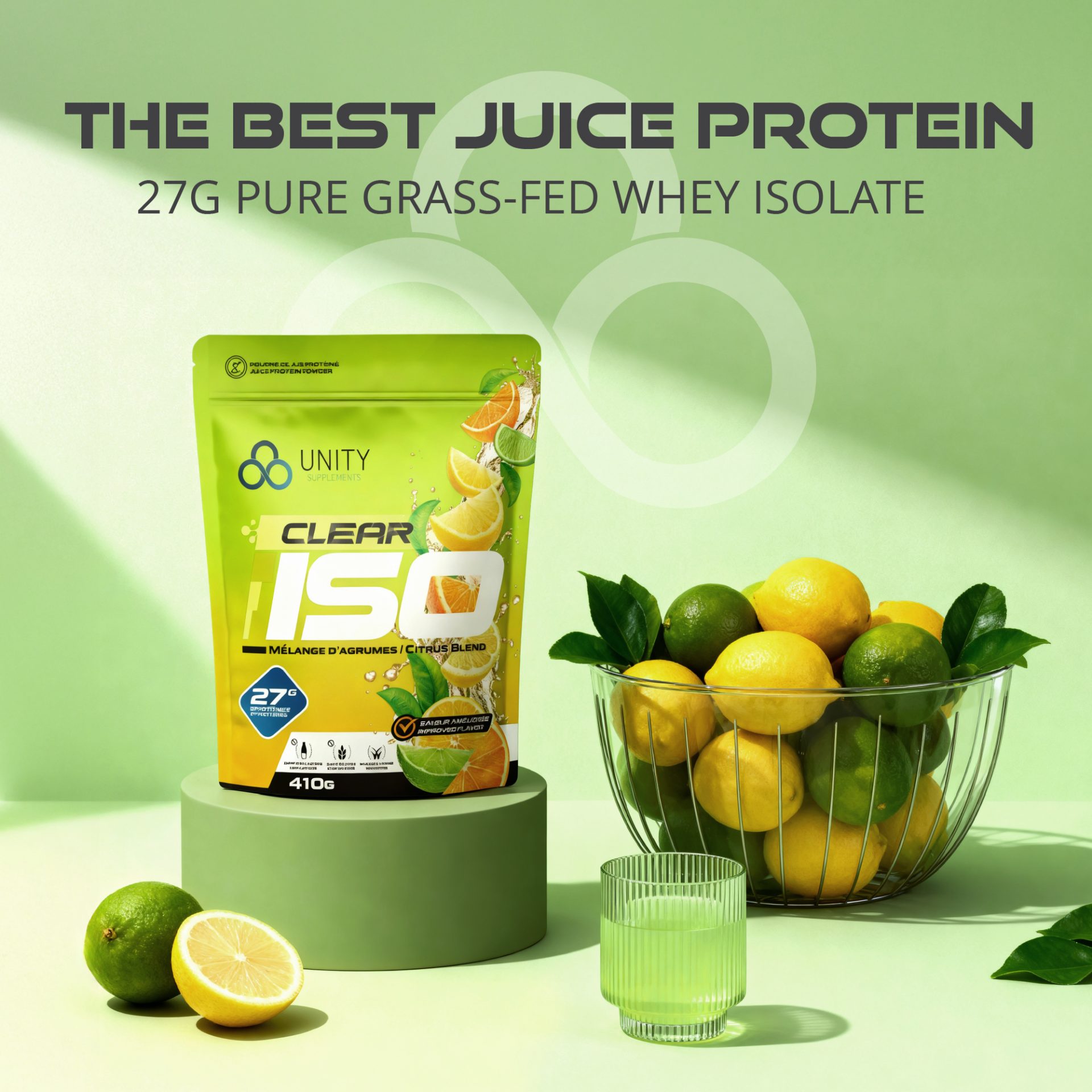 Created Amazon secondary images for Unity Supplements Clear ISO protein powder, a fruity, juice-style formula where flavour appeal is a key purchase driver. With only product renderings and brand typefaces provided, I developed a visual system that emphasized vibrant flavours and refreshment. To overcome the lack of assets, I combined AI-generated imagery using precise, flavour-focused prompts with carefully selected stock visuals, ensuring cohesive, on-brand compositions optimized for Amazon conversion.